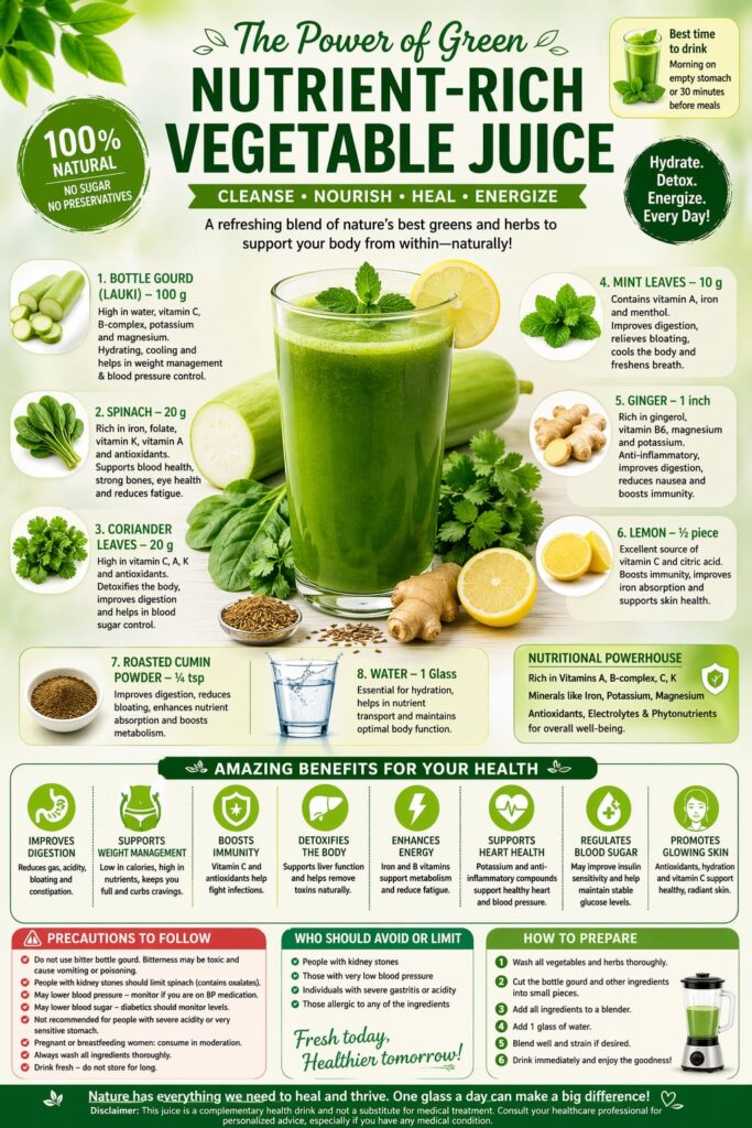 In recent years, natural health practices have gained significant attention as people increasingly seek simple, effective ways to support overall well-being. Among these, freshly prepared vegetable juices stand out as a convenient and nutrient-dense option. The combination of bottle gourd (lauki), spinach, coriander, mint, ginger, lemon, and roasted cumin seeds forms a powerful green juice that delivers hydration, essential vitamins, minerals, and bioactive compounds.
